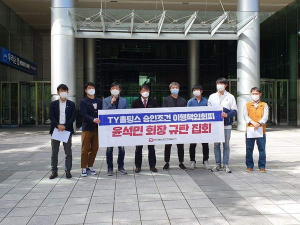 "TY홀딩스 승인 조건 이행 책임 회피 윤석민 회장 규탄 집회"가 오늘 오후 서울 여의도 태영빌딩 앞에서 열렸습니다. 예고한 대로, 윤석민 회장이 노동조합과의 협의 테이블이 나올 때까지 열리는 릴레이 '끝장 집회'입니다.