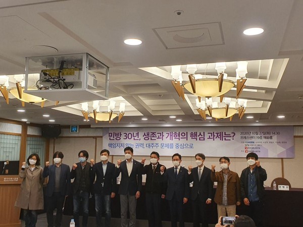 이는 지난 27일 열린 '민방 30년, 생존과 개혁의 핵심 과제는? 책임지지 않는 권력, 대주주 문제를 중심으로' 토론회(사진)의 핵심 주제였다. 이번 토론회는 더불어민주당 정필모·한준호 의원과 정의당 배진교 의원 주최로 서울 프레스센터에서 열렸다. 전국언론노동조합이 주관했다.