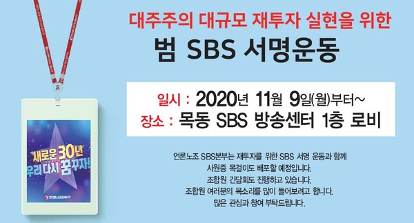 이를 위해서는 SBS 구성원들의 하나된 마음, 함께하는 발걸음이 필요합니다. 노동조합은 오늘부터 '대주주의 재투자를 위한 SBS 서명운동'에 돌입합니다. SBS 구성원들의 절실함을 한데 모으는 작업입니다. SBS 구성원의 간절함을 담아 대주주도 설득하고, 규제 기관인 방통위도 설득해 보겠습니다.