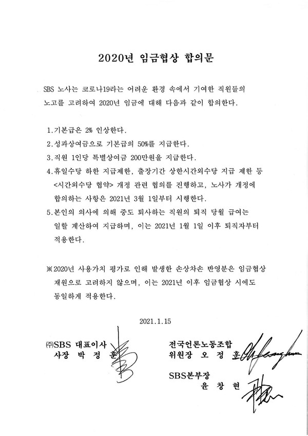 노동조합은 코로나 상황 속 묵묵히 일해 온 SBS 구성원들이 연초에 보다 많은 보상을 받을 수 있도록 조기 타결이 중요하다고 봤다. 이를 위해 단체협약 개정은 임금협상이 끝난 뒤 따로 진행하는 방침을 정하고 빠르게 협상을 진행했다.