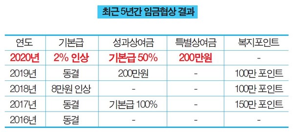 기본급을 기준으로 한 성과상여금, 같은 금액을 지급하는 특별상여금으로 분리한 것은 각각의 장점을 모두 충족시키기 위한 취지다. 평균 400만 원 정도의 현금 지급 가운데 절반은 연차대로, 절반은 똑같이 받는 셈이다. 2020년도 기본급 인상 소급분과 성과상여금과 특별상여금은 1월 급여에 반영된다.