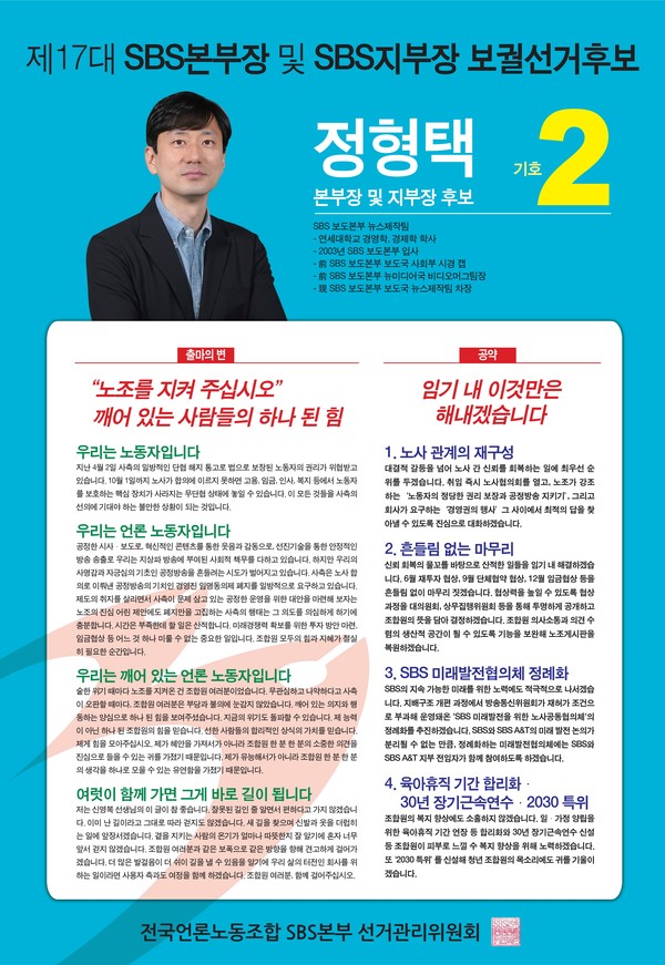 대결적 갈등을 넘어 노사 간 신뢰를 회복하는 일에 최우선 순위를 두겠습니다. 취임 즉시 노사협의회를 열고, 노조가 강조하는 ‘노동자의 정당한 권리 보장과 공정방송 지키기’, 그리고 회사가 요구하는 ‘경영권의 행사’ 그 사이에서 최적의 답을 찾아낼 수 있도록 진심으로 대화하겠습니다.