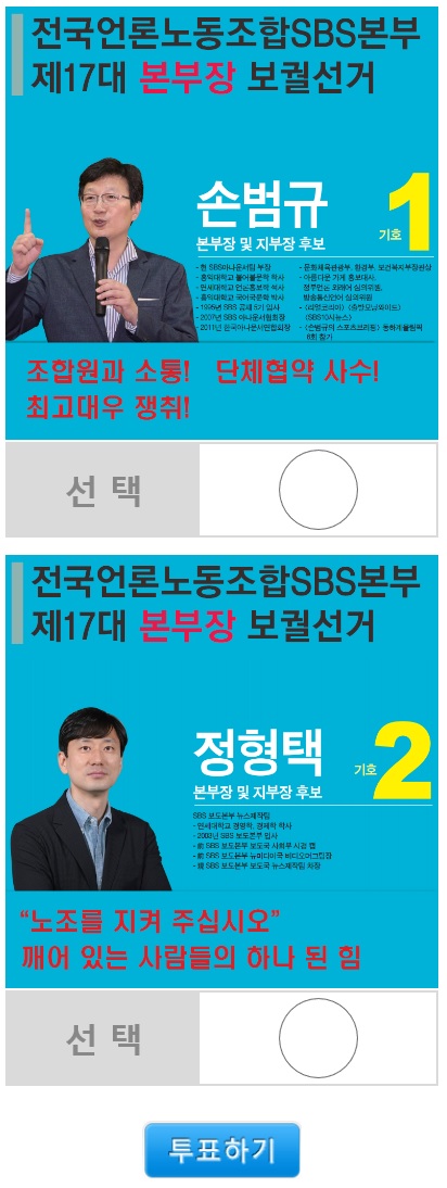 그러면 출마한 두 명의 SBS 본부장 후보가 보입니다. SBS본부장은 SBS지부와 SBS A&T지부, 스튜디오S지부 조합원이 모두 투표를 할 수 있습니다. 원하시는 후보를 선택해 투표합니다.