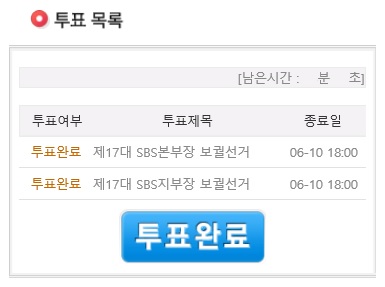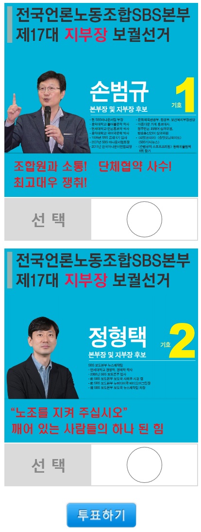 SBS지부 소속 조합원의 경우, 지부장 투표가 남아 있습니다. SBS지부 조합원은 다시 한 번 원하는 후보를 선택해 투표합니다.