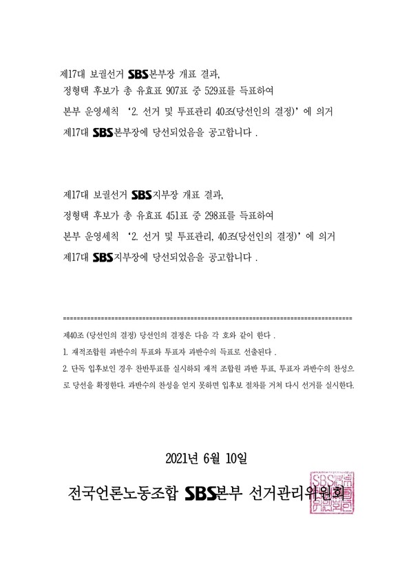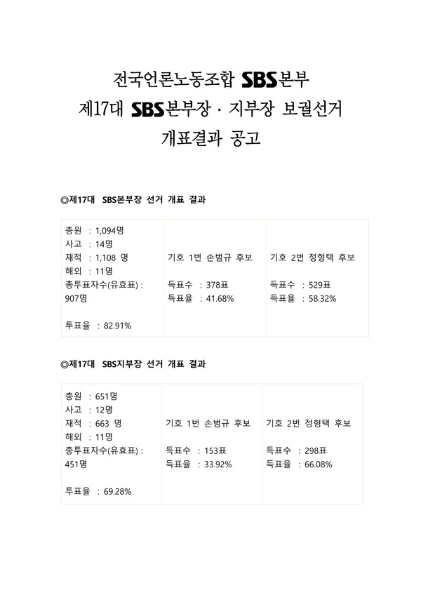 제17대 SBS본부 본부장 · 지부장 보궐선거 개표결과 공고