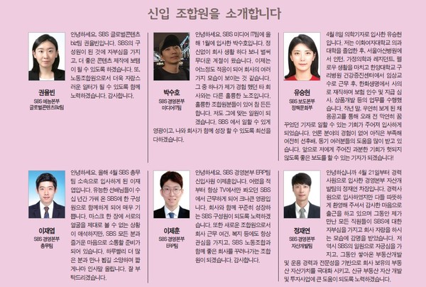 안녕하세요, SBS 글로벌콘텐츠biz팀 권율빈입니다. SBS의 구성원이 된 것에 자부심을 가지고, 더 좋은 콘텐츠 제작에 보탬이 될 수 있도록 하겠습니다. 또, 노동조합원으로서 더욱 자랑스러운 일터가 될 수 있도록 함께 노력하겠습니다. 감사합니다.