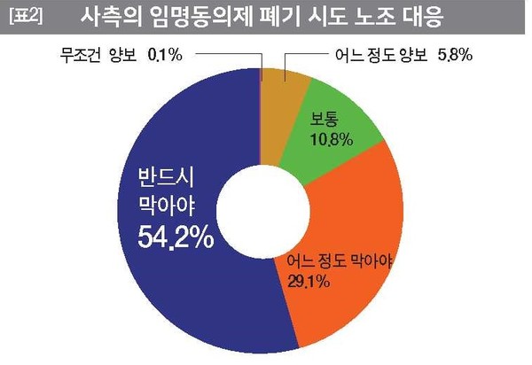 임명동의제의 가치를 허물려는 사측의 시도에 대해서도 83.3%(표2)가 “막아내야 한다”며 강력하게 요구하고 나선 것도 같은 맥락이다. 임명동의제 도입 당시 사측은 “방송의 공정성과 독립성을 강화하는 획기적인 조치”라며 보도 자료까지 내며 치켜세웠다. ‘소유 경영 분리의 선진적 모델’이라는 의미부여를 했던 것도 사측이었다. 기록으로 남겨진 이런 말들을 사측은 애써 잊고 외면하려하지만, 구성원 모두는 정확하게 기억하고 있다는 걸 이번 조사 결과는 명확하게 보여주고 있다.