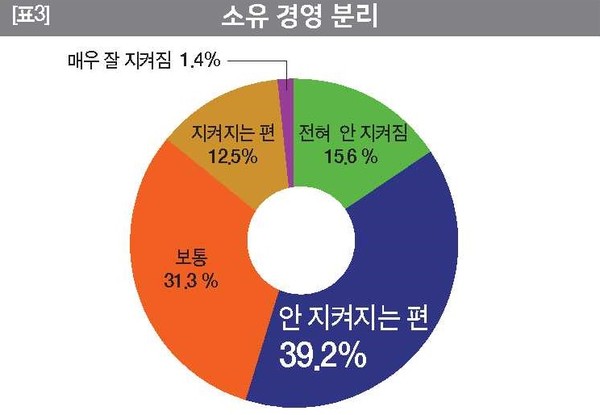많은 조합원들이 임명동의제가 도입된 이후에도 여전히 소유 경영 분리에 대한 현실적 위기감을 체감하고 있었다. “SBS의 소유 경영분리가 지켜지지 않고 있다”는 응답은 54.8%(표3)로 “지켜진다(13.9%)”는 답변보다 4배 가까이 나타났다. 소유 경영 분리 제도를 강화해도 모자랄 판에 임명동의제 마저 없애겠다고 나선 사측 행태가 얼마나 퇴행적인지를 보여주는 것이다.