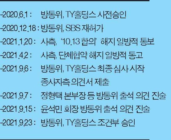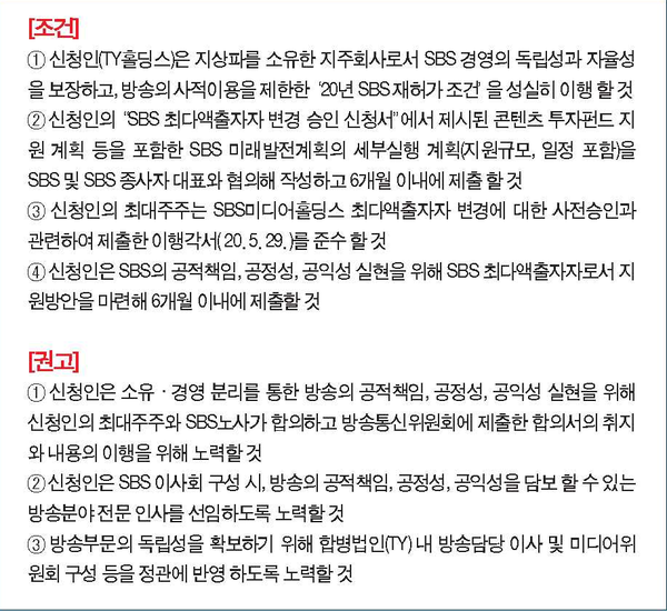방통위는 23일 SBS의 최다액출자자를 TY홀딩스로 변경하면서 조건 4개와 권고 3개를 부가했다. 그동안 노동조합과 시민사회가 줄기차게 주장했던 내용이 완벽하진 않지만 상당부분 반영됐다. 사측은 지난해 6월 사전 승인 이후 ‘공정방송과 소유경영 분리 원칙 실현, SBS에 대한 투자도 문제없이 하고 있다’고 주장하며 ‘조건과 권고’없는 ‘승인’을 받아내기 위해 방통위를 수차례 찾았지만 허사였다.