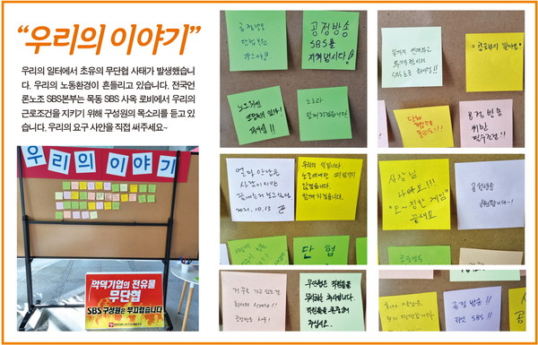 우리의 일터에서 초유의 무단협 사태가 발생했습니다. 우리의 노동환경이 흔들리고 있습니다. 전국언론노조 SBS본부는 목동 SBS 사옥 로비에서 우리의 근로조건을 지키기 위해 구성원의 목소리를 듣고 있습니다. 우리의 요구 사안을 직접 써주세요~