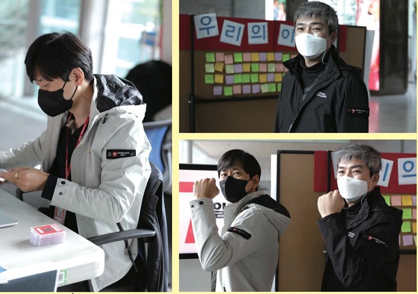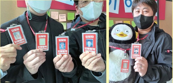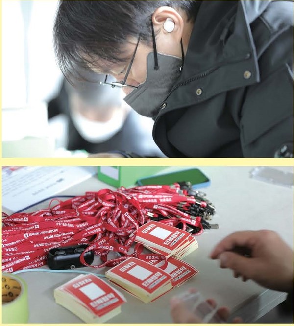 또 하나, 노조에서 제작한 사원증 케이스와 줄을 패용해주세요. ‘단체협약’을 하루빨리 되찾기 위해 우리의 의지를 표현한 별도 케이스와 줄을 준비했습니다. 노조 사무처가 방수 스티커를 제작해 로비에서 정성을 다해 한 장 한 장 케이스에 붙였습니다.
