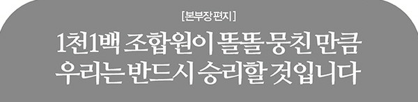 이 싸움에서 단 한 명의 조합원도 다치지 않게 하겠습니다. 철저히 이기는 싸움을 치밀하게 준비하겠습니다. 강철대오를 갖춘 우리를 사측의 무딘 칼로는 절대 뚫지 못할 것입니다. 제가, 노조가 맨 앞에 서겠습니다. 사측의 칼날에 누군가 다쳐야 한다면 그건 제가 될 것입니다.
