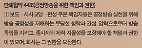단협 5장은 방송 노동자의 핵심적 근로조건인 ‘공정방송’이 명시된 권리장전이다. 공정방송 제도 일체를 5장에 새기면서 앞으론 제도의 가치를 둘러싼 소모적 논쟁이 재발되지 않을 전망이다. 이와 함께 보도준칙, 편성규약 등에 산발돼 있던 공정방송의 가치와 공정방송 책임자들의 임무를 단협 44조에도 명시했다.
