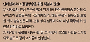 새롭게 임명동의 대상이 된 시사교양국장·편성국장의 책임과 권한 범위도 단협에 정리했다. 이들 국장을 공정방송 실현을 위한 시사교양·편성 부문의 ‘실질적 책임자(단협 43조)’로 정의하고, 공정방송 분야의 일체 권한이 국장에게 있다는 점을 명시했다.