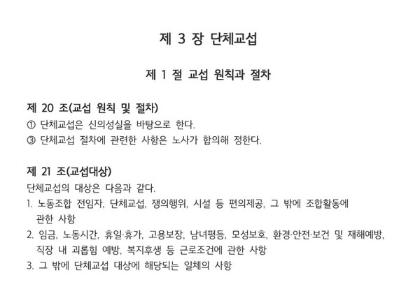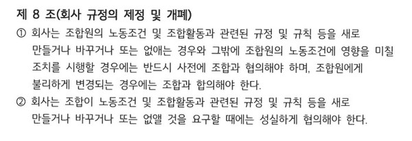 첫째, 노동조합의 이번 교섭 요구는 단체협약 제8조 제1항에서 "그밖에 조합원의 노동조건에 영향을 미치는 조치를 시행할 경우에는 반드시 사전에 조합과 협의해야 하며 조합원에게 불리하게 변경되는 경우에는 조합과 합의해야 한다“는 명문의 규정에 근거한 것입니다.