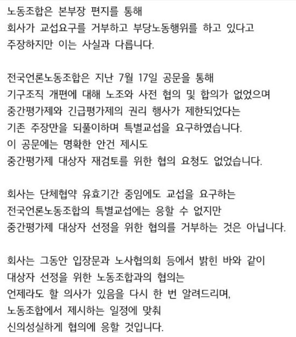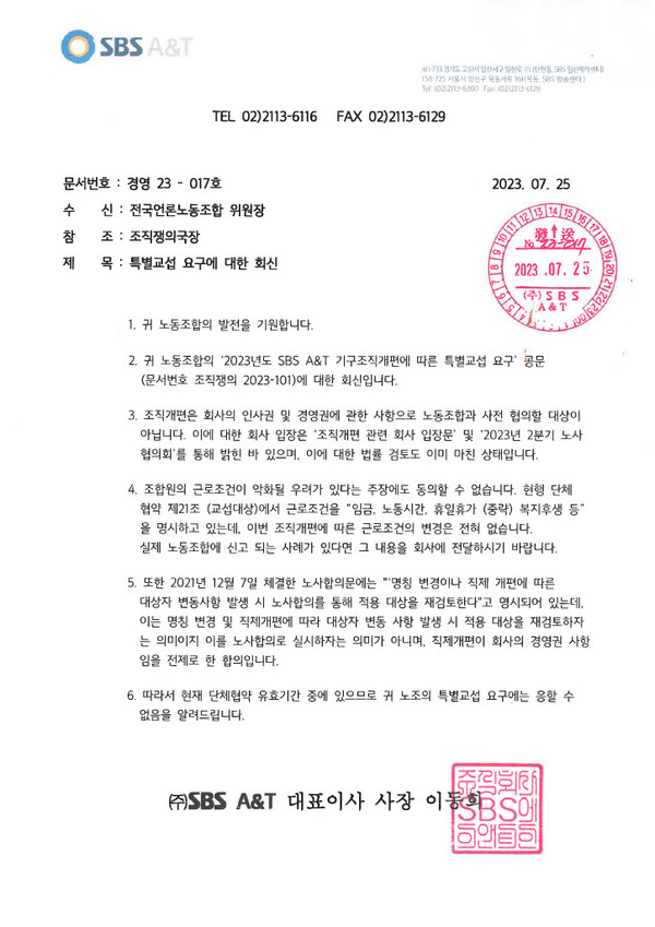 [참고] (SBS A&T) 사측 공문과 공지사항 (2023.07.25)