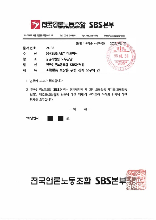 SBS A&T 임원급 인사 A씨의 부당노동행위가 알려진 지 한 달이 다 되어간다. 노동조합은 조합원 200여 명이 참여한 긴급 피케팅(3/25)을 연 데 이어, 해당 인사 처벌을 요구하는 탄원서 서명을 진행했다. 이번 탄원서 서명은 모바일로 진행됐으며, 닷새 만에 505명이 동참했다(*전국언론노동조합 SBS본부 총 조합원수 1103명/4월 15일 기준).