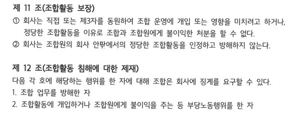 노동조합은 앞서 지난달 25일엔 A&T 사측에 해당 임원급 인사의 사내 징계를 요구하는 공문을 발송했다(* 사진1 참고). 노사가 합의한 단체협약 제 11조 <조합활동 보장>(* 사진2 참고)에 따르면 ‘회사는 정당한 조합활동을 이유로 조합과 조합원에게 불이익한 처분을 할 수 없’으며, ‘조합원의 회사 안팎에서의 정당한 조합활동을 인정하고 방해하지 않’아야 한다. 제12조 <조합활동 침해에 대한 제재>엔 ‘조합활동에 개입하거나 조합원에게 불이익을 주는 등 부당노동행위를 한 자에 대해선 조합이 회사에 징계를 요구할 수 있다’고 명시돼 있다.