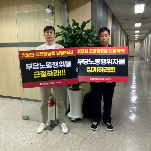 SBS A&T의 2024년 첫 노사협의회가 5월 9일 탄현에서 열렸습니다. 노사협의회 개최에 앞서 조합은 사측에 “부당노동행위 수사대상인 이희근 실장의 참석 배제”를 요청하는 공문을 발송했습니다. 그러나 사측은 "교섭위원 참석에 관한 결정은 대표의 권한”이라며 조합의 정당한 요구를 끝내 거부했습니다. 이에 SBS본부 노동조합 전임자 전원은 <부당노동행위를 근절하라>고 적힌 피켓을 들고 노사협의회가 열리는 회의실 앞에서 침묵시위를 진행했습니다(*아래 사진 참고).