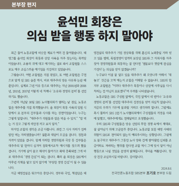 우리 SBS와 구성원들은 방송 산업의 무한 경쟁 속에서 제대로, 잘 살아남기 위해 고군분투 중입니다. 노동조합 또한 태영 사태의 위험이 SBS로 전이되지 않는지 예의주시하는 상황입니다. 그럼에도 불구하고 대주주가 그동안 노사 양측 간에 쌓아왔던 신뢰를 조금이라도 저버리는 행위를 한다면 조합 역시 그에 맞서 말이 아닌 행동으로 나설 것임을 분명히 밝혀둡니다. 무더운 여름입니다. 항상 건강 조심하시길 바랍니다. 감사합니다.