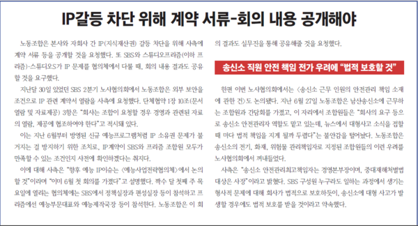 지난달 30일 있었던 SBS 2분기 노사협의회에서 노동조합은 외부 보안을 조건으로 IP 관련 계약서 열람을 사측에 요청했다. 단체협약 1장 10조(문서열람 및 자료제공) 3항은 “회사는 조합이 요청할 경우 경영과 관련된 자료의 열람, 제공에 협조하여야 한다”고 적시돼 있다.