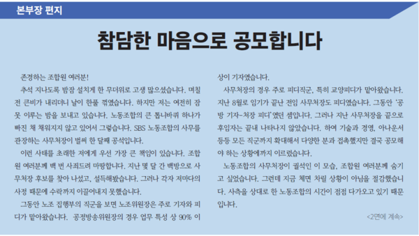 추석 지나도록 밤잠 설치게 한 무더위로 고생 많으셨습니다. 며칠 전 큰비가 내리더니 날이 한풀 꺾였습니다. 하지만 저는 여전히 잠 못 이루는 밤을 보내고 있습니다. 노동조합의 큰 톱니바퀴 하나가 빠진 채 채워지지 않고 있어서 그렇습니다. SBS 노동조합의 사무를 관장하는 사무처장이 벌써 한 달째 공석입니다.