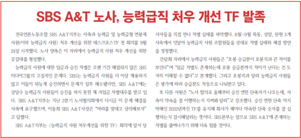 전국언론노동조합 SBS A&T지부는 사측과 능력급 및 능력급형 연봉제 사원(이하 능력급직 사원) 처우 개선을 위한 태스크포스TF 첫 회의를 9월24일 시작했다. 노사 양측은 이 자리에서 능력급직 사원 처우 개선을 위한 공감대를 형성했다.