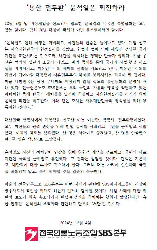 “윤석열로 인해 국정은 마비되고, 국민들의 한숨은 늘어나고 있다. 계엄 선포는 자유대한민국의 헌정질서를 짓밟고, 헌법과 법에 의해 세워진 정당한 국가기관을 교란시키는 것으로써, 내란을 획책하는 명백한 반국가 행위다. 지금 용산은 범죄자 집단의 소굴이 되었고, 계엄 독재를 통해 국가의 사법•행정 시스템을 마비시키고, 자유민주주의 체제의 전복을 기도하고 있다. 자유민주주의의 기반이 되어야할 대통령이 자유민주주의 체제를 붕괴시키는 괴물이 된 것이다. 지금 대한민국은 당장 무너져도 이상하지 않을 정도의 풍전등화의 운명에 처해 있다. 전국언론노조 SBS본부는 우리 국민의 자유와 행복을 약탈하고 있는 파렴치한 독재 반국가 세력들을 일거에 척결하고 자유헌정질서를 지키기 위해 윤석열 퇴진을 촉구한다. 이와 같은 조치는 자유대한민국의 영속성을 위해 부득이한 것이다.”