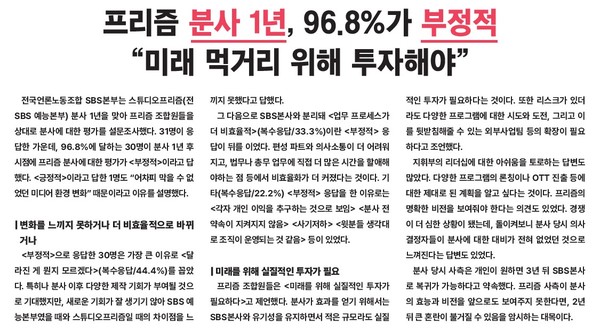 전국언론노동조합 SBS본부는 스튜디오프리즘(전 SBS 예능본부) 분사 1년을 맞아 프리즘 조합원들을 상대로 분사에 대한 평가를 설문조사했다. 31명이 응답한 가운데, 96.8%에 달하는 30명이 분사 1년 후 시점에 프리즘 분사에 대한 평가가 <부정적>이라고 답했다. <긍정적>이라고 답한 1명도 “어차피 막을 수 없었던 미디어 환경 변화” 때문이라고 이유를 설명했다.