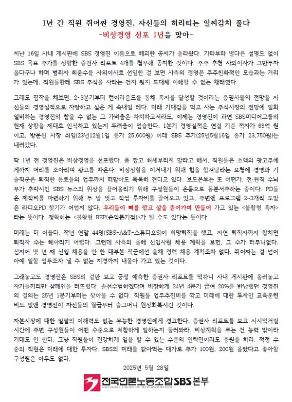 그래도 짐작을 해보면, 2~3분기부터 턴어라운드를 통해 흑자를 달성할 것이라는 증권사들의 전망을 자신들의 경영실적으로 자랑하고 싶은 게 속내일 테다. 미래 기대감을 먹고 사는 주식시장의 전망에 일희일비하는 경영진의 참을 수 없는 그 가벼움은 차치하고서라도, 이제는 경영진이 과연 SBS미디어그룹의 현재 상황을 제대로 인식하고 있는지 두려움이 엄습한다. 1분기 경영실적은 연결 기준 적자가 69억 원이고, 방문신 사장 취임(23년12월1일 종가 25,600원) 이래 SBS 주가(25년5월16일 종가 23,750원)는 내려갔다.