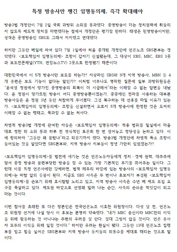 하지만 그동안 베일에 싸여 있다 7월 1일에야 처음 공개된 개정안에 언론노조 SBS본부는 경악했다. <보도책임자 임명동의제> 조항이 갑자기 신설됐는데, 그 대상이 KBS, MBC, EBS 3곳과 보도전문채널(YTN, 연합뉴스TV) 2곳으로 한정됐기 때문이다.