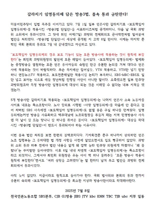 전국언론노동조합 SBS본부, CJB G1방송 JIBS JTV kbc KNN TBC TJB ubc 지부 일동
