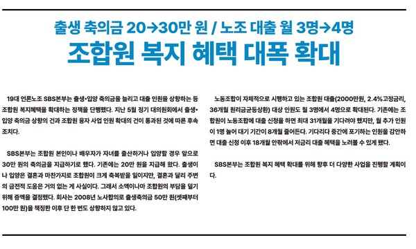 19대 언론노조 SBS본부는 출생•입양 축의금을 늘리고 대출 인원을 상향하는 등 조합원 복지혜택을 확대하는 정책을 단행했다. 지난 5월 정기 대의원회에서 출생•입양 축의금 상향의 건과 조합원 융자 사업 인원 확대의 건이 통과된 것에 따른 후속 조치다.
