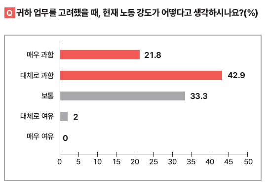 조합원들은 장시간 근무를 하고도 충분한 휴식을 보장받지 못하는 이유로 △업무 수행 인원 부족 △기한 내 마쳐야할 업무가 많아서 △상사의 지시 혹은 부탁 등을 이유로 꼽았다.