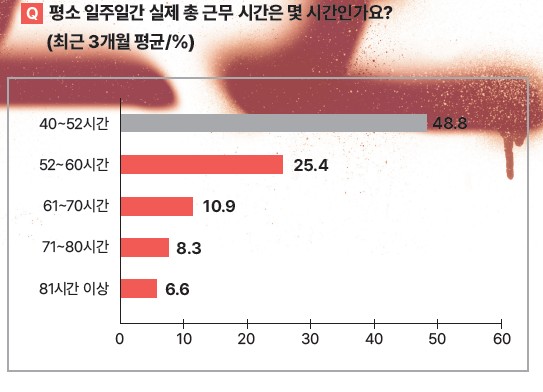 설문 조사에 따르면 조합원 10명 중 6명 이상은 <노동 강도가 과하다>고 답했다. 구체적으로 3개월 평균을 내봤을 때, <주당 근무시간이 52시간 이상>된다고 답한 조합원도 10명 중 5명이 넘었다. 심지어 <81시간 이상 근무>한다고 답한 인원도 6.6%나 있었다. 3년 전 조사와 비교해도 81시간 이상 살인적인 노동을 하고 있는 조합원은 늘었다.(4.7% -> 6.6%)