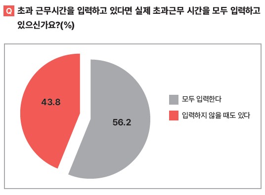 초과 근무시간을 입력하지 못하고 있는 이유로 조합원들은 △눈치가 보여서 △결재권자가 시간외 수당에 대해 예민하게 반응해서 △퇴근 후 집에서 업무 보는 경우는 입력하기 애매해서 △입력 기간(10일)이 지나가면 하지 못해서 △너무 바빠서 등을 꼽았다.