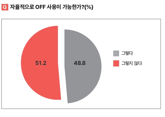 초과 근무시간이 발생할 것으로 예상되면 OFF를 사용하는 것이 제일 적절한 방법이지만, 아직도 <자율적 OFF사용이 어렵다>는 답변이 절반을 넘었다.