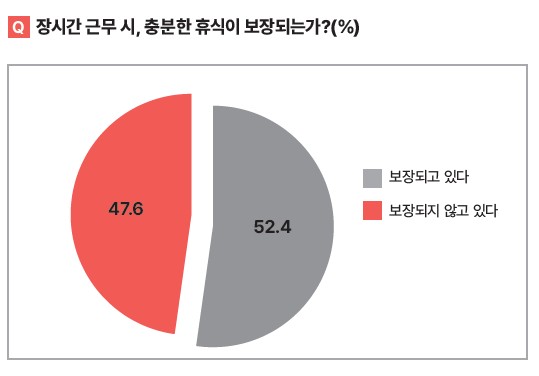 노사가 합의한 <시간외근무수당 및 유연근무제 협약>은 장시간 연속 근무를 하는 직원들의 필수 휴식시간을 보장하라고 명시하고 있다. 일부 예외가 있을 수 있지만, 1회 근무시간은 13시간 이내를 원칙으로 하며, 다음 근무가 시작되기 전까지 최소 8시간의 휴식시간은 보장해야한다는 것이다. 하지만 이번 설문조사에서 <장시간 근무 시간 후 충분한 휴식이 보장되고 있지 않다>고 답한 비율이 50%에 육박해 노동자의 건강권이 위험 수위에 도달한 것으로 보인다.