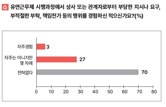특히 충분한 휴식을 보장해야할 상사가 오히려 부당한 연속 업무를 지시하거나 부탁하는 등의 <유연근무제와 관련해 상사나 관계자로부터 부당한 지시나 요구, 부적절한 부탁 등을 경험했다>는 답변은 30%에 달했다.