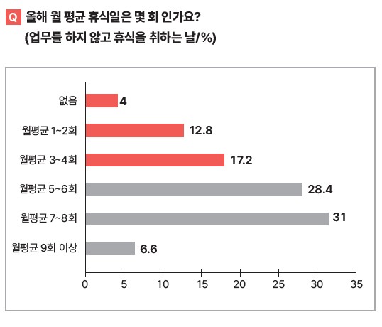 <시간외근무수당 및 유연근무제 협약>에서 노사는 “선택•재량A•재량B 근무자의 최저 OFF일은 월 6일로 한다”고 합의했다. 이론상 무제한 노동이 가능한 재량A라 할지라도 최소 월6일의 휴무를 보장해 극한의 노동 환경은 막자는 취지다. 하지만 이번 설문조사에서 월평균 <한 달에 5일도 쉬지 못하는> 조합원이 34%에 달했다. 계엄 사태와 대선 이벤트가 이어진 여파로 해석된다. 일과 가정의 양립이란 가치가 무너지는 수치인 것은 물론 직원 개개인의 건강권이 침해되는 수준이다.