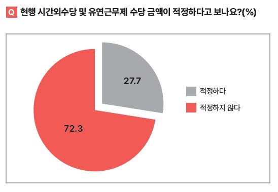 조합원들은 시간외수당과 유연근무제 수당이 적정하지 않은 이유로 △물가상승 △노동 강도 대비 턱없이 부족 △근무시간 입력 못하는 경우도 많은데, 액수가 지나치게 적음 등을 꼽았다. 특히나 △법적으로 시간외수당은 통상임금의 1.5배여야 함 등의 법에 따른 적정 수당 지급을 요구하는 조합원이 많았다.