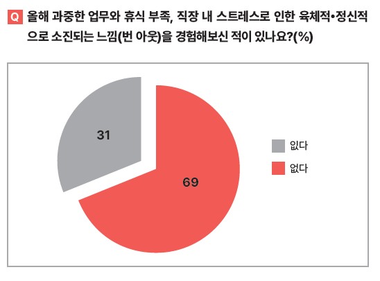 이번 설문조사 결과를 보면 3년 전 조사 결과와 마찬가지로 인원 부족과 과도한 근무, 상사의 부적절한 근무 지시 등이 여전한 노동환경의 문제점으로 꼽힌다. 오히려 부당한 근무 지시 등을 경험한 수치는 늘었다. 특히 노동환경 악화가 수년째 이어지면서, 번 아웃을 경험했다는 조합원은 10명 중 7명에 달했다.